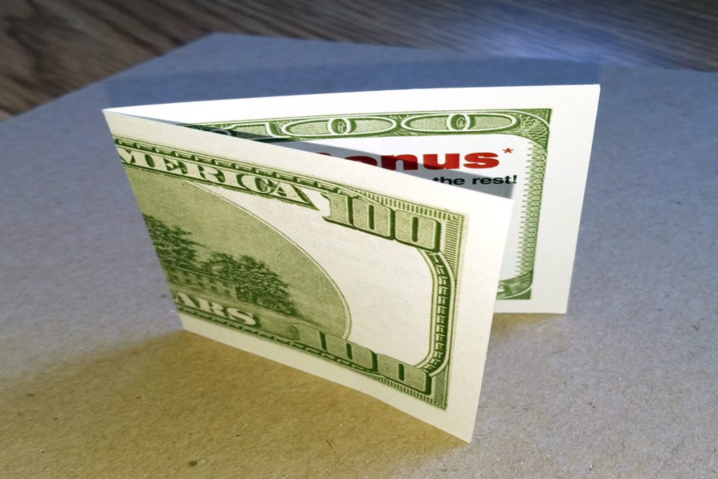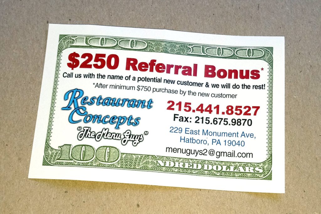 A simple way to get a customer to return. As small as $1 Off on the next visit will do the job. Our most popular is a $ bill in single or four color. A folded $100 bill on the outside brings a smile to the customers face. Some customers ask for extras to give to their friends.